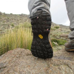 Největším přínosem má být inovovaná vnějšího běhounu z materiálu TPE. Při vyšší adhezi, tedy schopnosti neklouzat, by měla mít i vyšší životnost, tedy odolnost proti fyzickému opotřebení – což jsou vlastnosti dosud u vibramu spíše vzácné a v podstatě protichůdné. Boty jsem testoval na různém povrchu a v různém počasí – na suché, sluncem rozpálené žule a podobných vyvřelinách, které se vyznačují hrubostí a tvrdostí, na mokrém pískovci v soutěskách řeky Tugely i v metr vysoké trávě, bažinách a suťoviskách Dračích hor v Lesothu a na extrémně odolném křemenném „mountain Sandstone“ pískovci na oceánském pobřeží. Na mokrém pískovci jsem byl často překvapen, že v daném úhlu a zatížení podrážka nesklouzla, ale jindy jsem se zase přesvědčil, že úplně bezhlavě se na to spolehnout nedá.