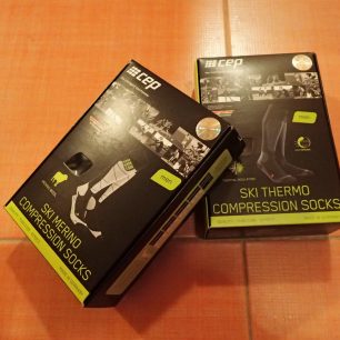Ponožky jsou krásně zabaleny v krabičkách s názvem, označením, parametry, tabulkou velikostí a nápisem MADE IN GERMANY. Natažení na nohy proběho bez problémů. Ani po X použití nepociťuji ochabnutí komprese. Ponožky jsou výrazně označeny velkými písmeny L a R. Po natažení si ještě ponožky na nohách porovnám (překroucení) a dobře natáhnu. Horní lem je dostatečně široký a příjemně pružný, takže o něm celý den při lyžování nevím. Užíval jsem si v ponožkách CEP i návrat z lyžování, protože unavené nohy při řízení nebo sezení v autě jsou stále v kompresi.