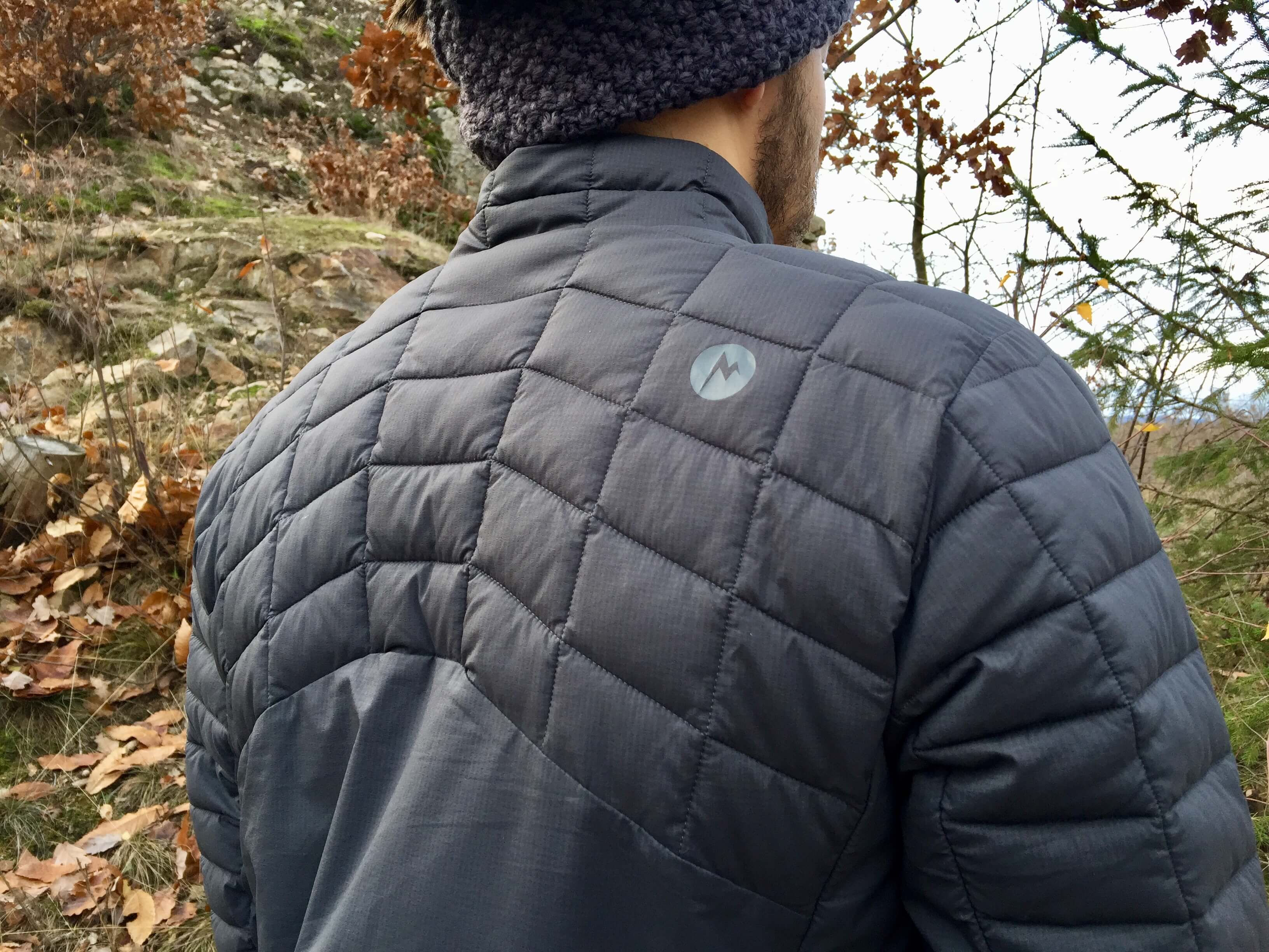 Detail zateplení zad bundy Marmot Featherless Hybrid.