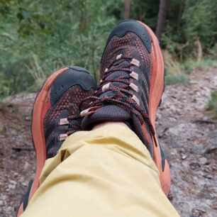 Nejdříve mě zaujalo výrazné tlumení, které vizuálně podporuje i boční zvlněný profil. Celkově z boty na první pohled je jasné, že bude dobře vytlumená. Pata je přizvedlá a podporuje tak odvalování při rychlé chůzi. Souhlasím a potvrzuji zařazení této boty do kategorie ACTIVE HIKING (dříve SPEED HIKING). Testoval jsem i během a i ten jsem si náramně užil.