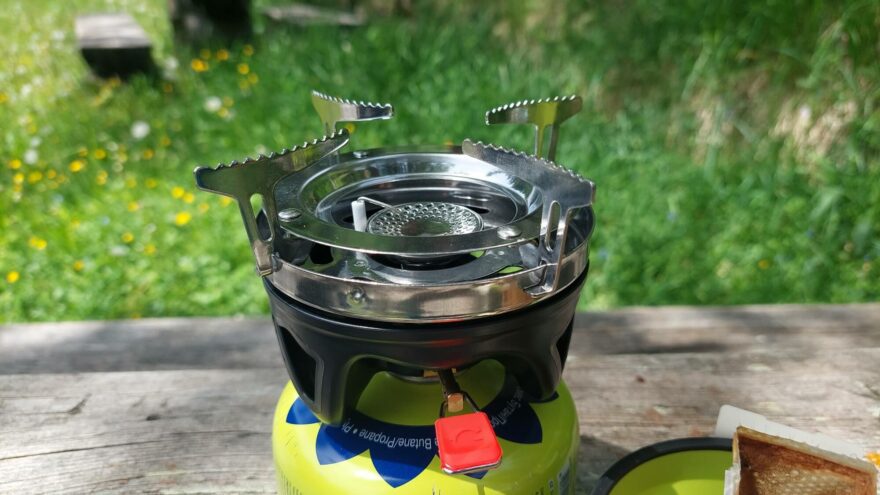 Zapálení plamene se děje pomocí vestavěného piezo zapalovače. Osobně mám vyzkoušeno, že u testovaného modelu bylo k zapálení plamene zapotřebí pustit plyn takřka naplno a pak ztlumit podle potřeby. Regulace plamene je plynulá, ale hořák je malého průměru a může tak docházet k bodovému ohřevu pokrmů v nádobách. Ventil hořáku je sklápěcí pro uložení do ešusu.