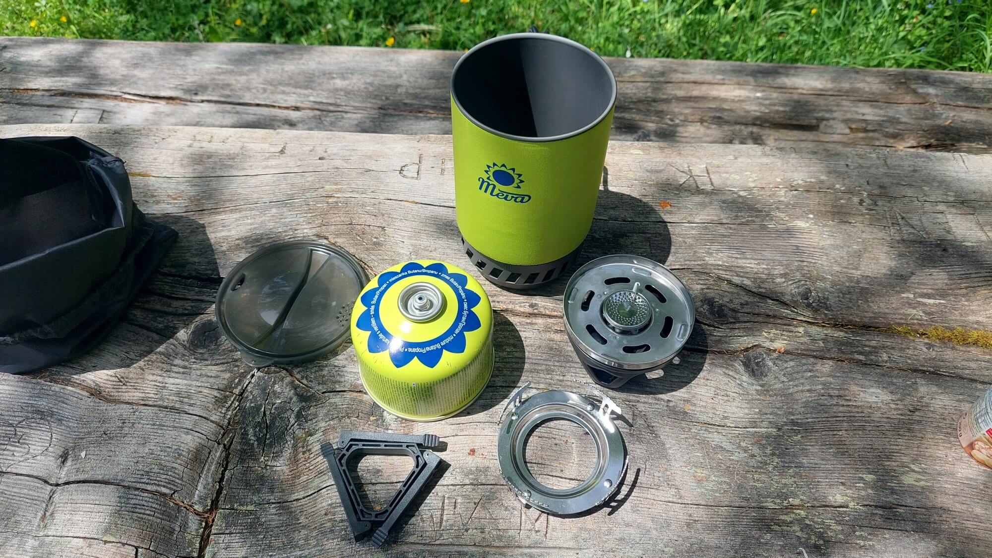 Ocenil jsem velikost nádoby se značeným objemem až 1.1 l (s MAX. označením 0.8 l) tak, že se do ešusu vejde plynová kartuše 230 g. Všechno při složení do sebe pasuje a uvnitř ešusu „nerachtá“. Líbil se mi i adaptér na vaření na jiných nádobách. Dále jsem si i myslel, že je vařič snad nepřesně vyroben a to díky velké vůli mezi jednotlivými díly. Nakonec se ukázalo, že stačilo utáhnout hořák pouhým jeho otočením po směru hodinových ručiček. A vůle byla pryč. Udávaná hmotnost je včetně plné kartuše. Bez ní váží vařič MEVA TRIPPER necelých ½ kg. Ušetřit na hmotnosti můžete vyjmutím redukce, trojnožky nebo i použitím poloprázdné kartuše.