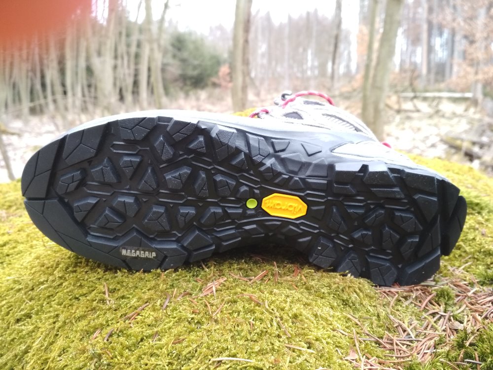 Na podrážce jsem se dočetla, že mají hluboký vzorek, který dobře drží – Megagrip a že má být odpružená – Vibram. Podrážka Vibram® Signal Megagrip je vybavena speciální zónou na patě pro maximální přilnavost při chůzi a zvláště při sestupu. Na špičce je i lezecká neboli climbing zona. Nápisy nelžou, dokonce jsem byla mile překvapena, že podrážka není tak moc tvrdá, jak u klasických pohorek bývá. Samozřejmě to má svůj význam, ale když chcete boty na treky, je fajn mít podrážku, co drží, neklouže a současně je mírně pružná. Zkoušela jsem její přilnavost na kamenech a v hloubi mysli byla na ferratách.