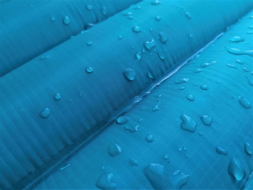 Zkoušela jsem také chování karimatky na vlhké trávě a při větším množství vlhkosti se voda trochu vpila do spodní části, která tím ztmavla, nicméně podle všeho zůstala v povrchové vrstvě materiálu, protože jako uživatel jsem necítila rozdíl. Tato situace mě dovedla k „domácí zkoušce“ voděodolnosti, kterou jsem provedla pro oba povrchy. Vždy jsem na část povrchu nalila trochu vody a kapičky zde nechala přibližně půl hodiny stát (včetně oblastí mezi jednotlivými vlnami, kde mě zajímalo, jestli se voda nebude vpíjet více). Horní (modrý) povrch se ukázal odolnější, zatímco na stříbrném docházelo k již zmíněnému mírnému vpíjení kapek a tmavnutí materiálu, jak je patrné i z pořízených fotek. Po osušení papírovou utěrkou a následném přitlačení další suché utěrky na povrch ani v jednom případě utěrka nenasákla vodou.