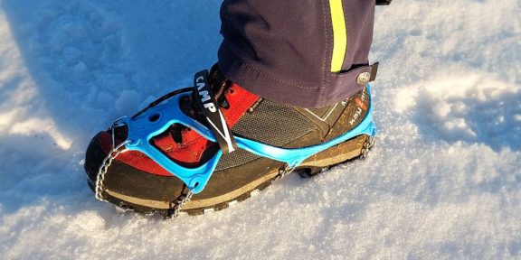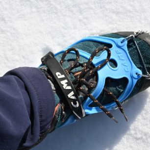Nazouvání jde snadno a myslím si, že po prvním nasazení se rychle zorientujete a najdete předek a zadní poutko na první dobrou. Rychle se zorientujete také díky šipce a logu CAMP na elastomeru a také pomocí kovové hrazdičky, která fixuje řetízky na špiče boty tak, aby nesjížděly do stran.