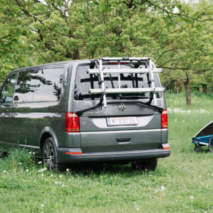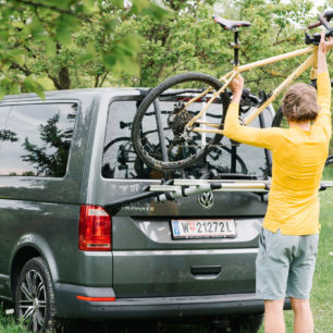 Zaujalo mě, jak snadné je nosič připevnit a zase odejmout. To se výborně hodí, protože parkujeme na ulici ve Vídni a raději nosič odnáším po výletě do sklepa, aby nebyl zcizen. Ve sklepě máme pro nosič vyhrazen prostor zhruba 1,5 x 0,5 x 1 metr. Montáž je velice jednoduchá, trvá maximálně pět minut včetně vynesení nosiče ze sklepa. Při lehce otevřených zadních dveřích se nosič nasadí shora na dveře a dvěma šrouby se přichytí ke dveřím z boku. Do auta se přitom pochopitelně nic nevrtá.