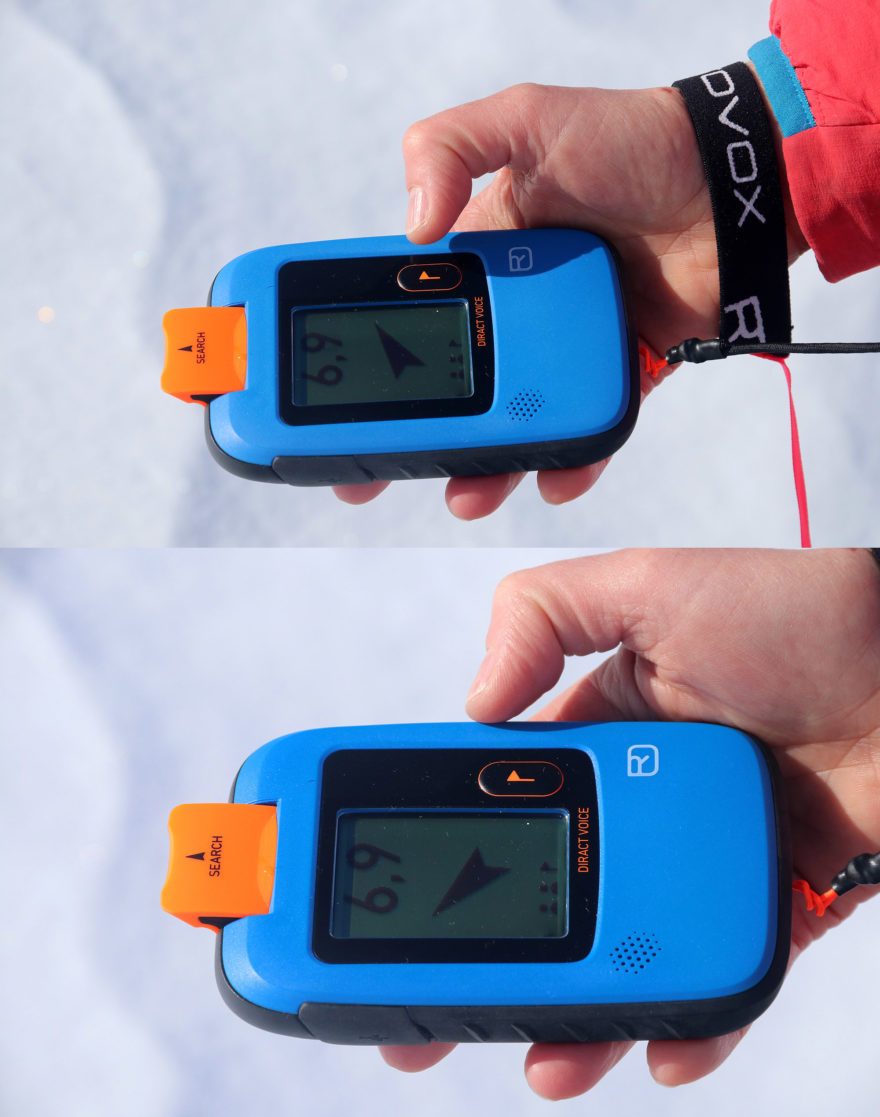 Při jemném dohledání jsme zkoušeli jak na sněhu různé vzájemné pozice „hledaného“ a „vyhledávajícího“ s tím, že vzorek Ortovox Diract Voice ve více než polovině případů ukazoval vzdálenosti odlišné od reality ať už v křížovém nebo diagonálním umístění. Často tak ukazoval 0,1 m i v případě, že byl od „hledaného“ vzdálen 0,3-0,4 m. Následně ukazatel vzdálenosti přeskočil na 0,5-0,6 m, aby se po několika vteřinách vzpamatoval na reálnou vzdálenost.