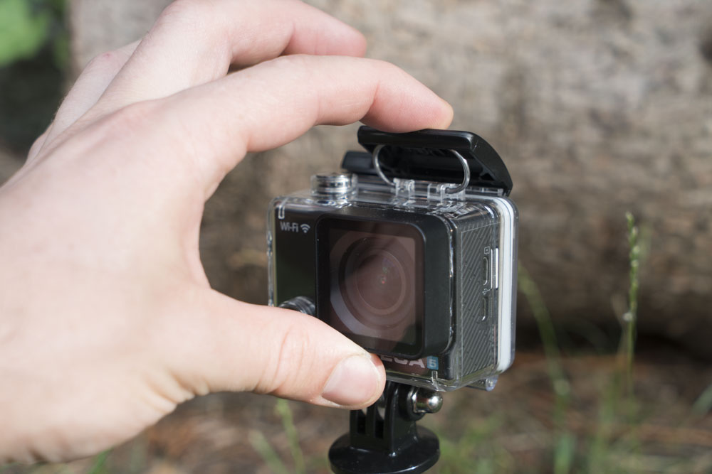 Vše se naštěstí změní, pokud vložíte kameru do vodotěsného obalu. Vložení i vyjmutí probíhá lehce bez vyklepávání či páčení. Zavírací mechanismus je jednoduchý, avšak účinný. V obalu neztratíte přístup k žádnému z tlačítek, nejste tak omezeni v plném ovládání všech funkcí kamery. Vodotěsný obal má navíc vyjmatelná zadní dvířka, jež můžete nahradit dvířky s průduchy (součástí balení). Ztratíte tím sice vodotěsnost, ale získáte lepší záznam zvuku a také lepší chlazení kamery. Navíc zůstane zachována alespoň částečná ochrana proti prachu, vlhkosti a hlavně nárazu (pádu). Osobně používám tato dvířka kdykoli, když neprší.