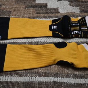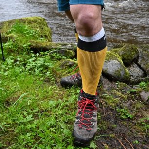 Exponovaná místa jsou zesílena polstrovanými zónami. Horní lem je dostatečně široký a příjemně pružný, takže jsem o něm celý den při túře nevěděl. Navíc zamezuje sjíždění podkolenek tak, že například ani během celodenního šlapání jsem si je ani jednou nemusel natahovat zpět. Komprese je citelná, ale ne nepříjemná. Dodává pocit jistoty a chuť šlapat dál. Pomáhala i mi při dlouhých sestupech, kdy citelně zabraňovala otřesům lýtkového svalu.