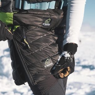 Péřová sukně má v zadní části pasu protiskluzový pás a čtyři očka po obvodu na případný pásek, takže sukně drží stále na svém místě. V přední části jsou opět dvě kapsy s obráceným zipem, kapsy jsou dost velké, např. na mobilní telefon. Na každé straně je oboustranný zip. Při malém rozepnutí vás sukně neomezuje v pohybu. Když si potřebujete sukni obléknout přes např. softshellové kalhoty, stačí sukni na jedné straně rozepnout úplně a pohodlně obléknout. Logo KWAK v pravé dolní části jako u vesty. Místo přišití loga mají oba dva produkty stejné, takže k sobě hezky ladí.