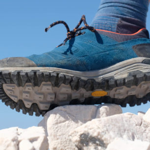 Podešev zajišťuje měkký došlap, kvalitní záběr i stabilitu v různých typech terénu. Jedná se značkovou podešev VIBRAM® Tubava. Špička a pata má gumovou obsázku zajišťující ochranu vůči kamenům i okopu. Ta utrpěla jeden šrám při lezení na ostrém vápenci a sbíhání suťoviskem. Nic však tragického a kapka lepidla to spraví. Lezeckou špičku však na těchto botách nehledejte. I přesto zvládly tyhle boty lehké ferraty a kombinovaný terén.