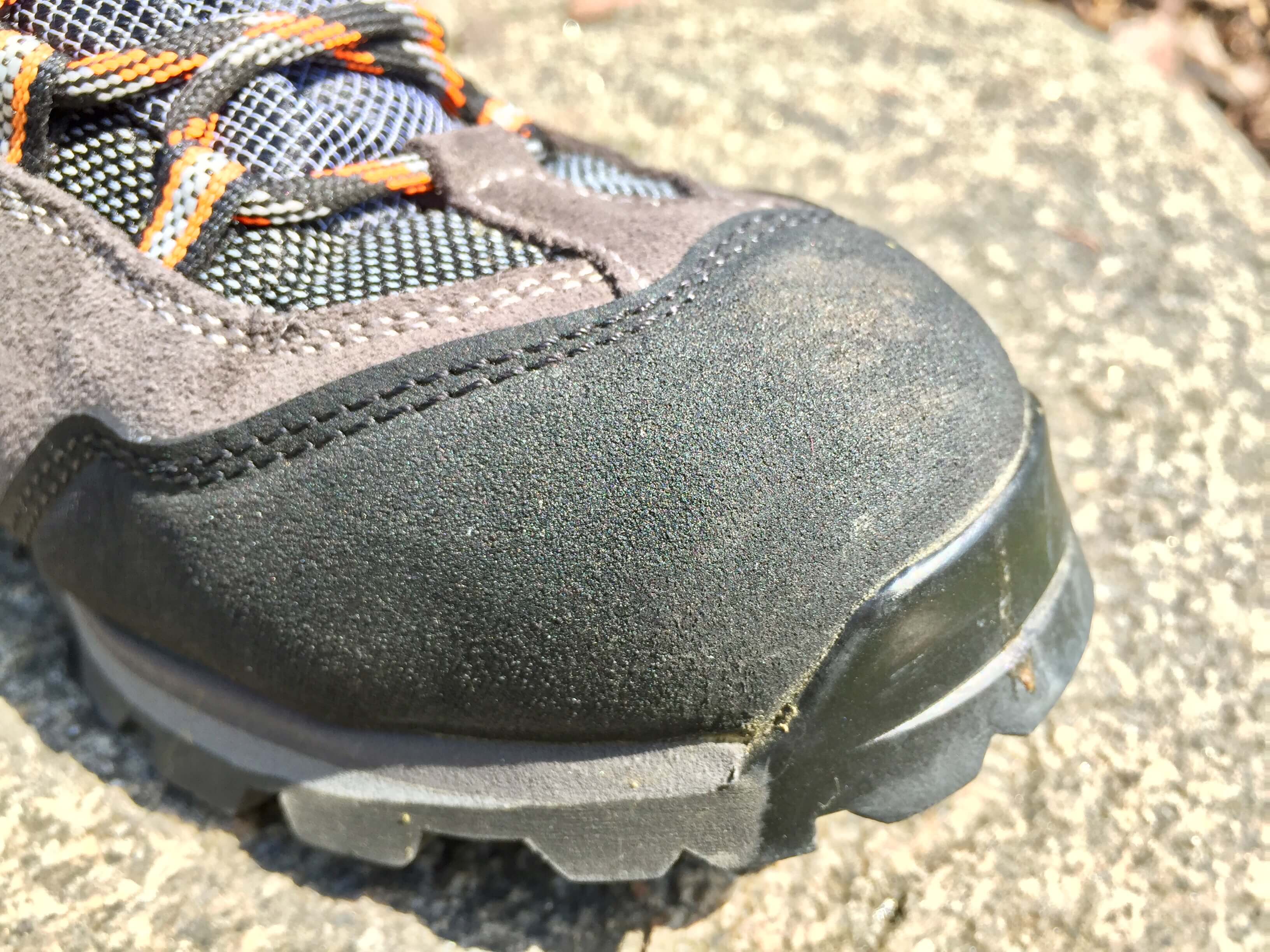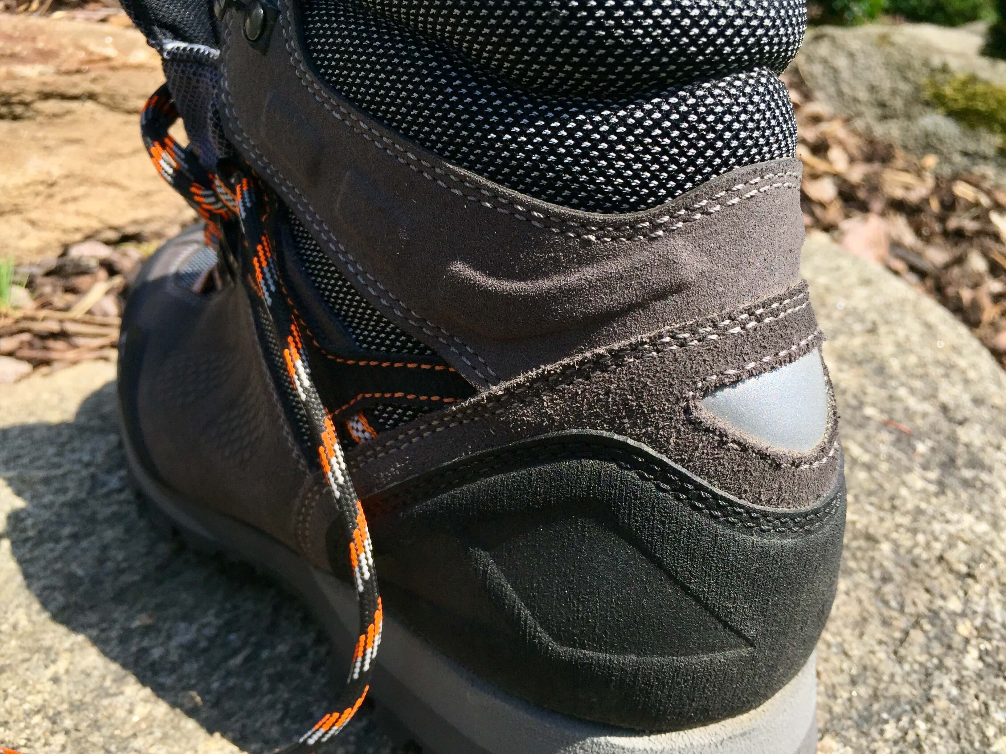 Svrchní materiál obuvi je hovězinový velur (tl. 1,8 – 2,0 mm) v kombinaci se syntetikou. Velmi se mi líbí ochrana obuvi v přední i patní části. Bota je totiž vybavena gumovou obsázkou, nemusíte se tedy bát občas něco nakopnout. Zároveň je třeba počítat s tím, že díky přední gumové obsázce se bota téměř nevyšlápne. Jelikož je bota tvořena kombinací materiálu, najdeme na ní mnoho švů. Do budoucna se tak impregnování svršku pravděpodobně nevyhneme (platí u všech bot, když membrána odejde). Výrobce si na zpracování dal záležet a řada švů na svrchní části je zdvojených. Boty jsou vybaveny 6 očky pro tkaničky (1. textilní, 2. textilní, 3. kovové, 4. kovové, 5. textilní, 6. kovový háček). Celá bota se dá opravdu dobře stáhnout. Páté, textilní očko, je prodloužením popruhu, který vede směrem k patě. Díky tomu dochází k ještě lepší fixaci kotníku. Toto očko je tedy nejvíce namáhavé, ocenil bych tedy nějaké vyztužení. Všichni totiž víme jak dopadá dlouhodobé tření dvou textilních komponentů. Během testování jsem však žádný náznak problému nezaregistroval (možná jsem jen paranoidní).