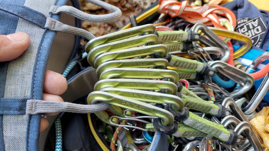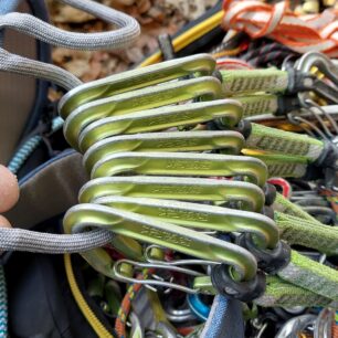 Dostatečně tuhá materiálová poutka doplňuje zadní poutko na drobnosti, jako je mg pytlík, rukavice nebo lezečky. Do poutek se vešlo opravdu vše potřebné. Testovaná kapacita poutek je min. 8 karabin. Vycvakávání i nacvakávání materiálu v pohodě.