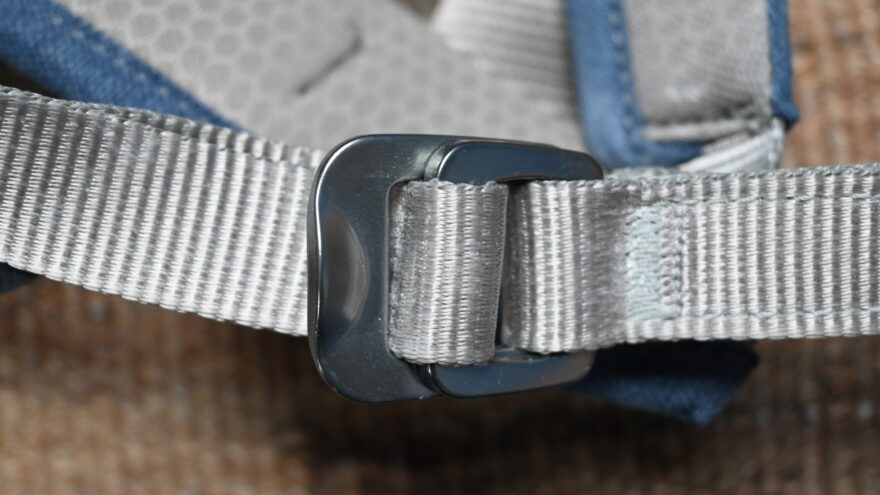 Ty jsou hliníkové a klasické rámečkové. Sedák tak i přesto jde kompletně rozebrat. Moc důvodů proto není, snad kromě maček, ale i to může být výhodou. Tyto hliníkové přezky chodí hladce a zajišťují rychlé a přesné dotažení pasu i nohaviček.