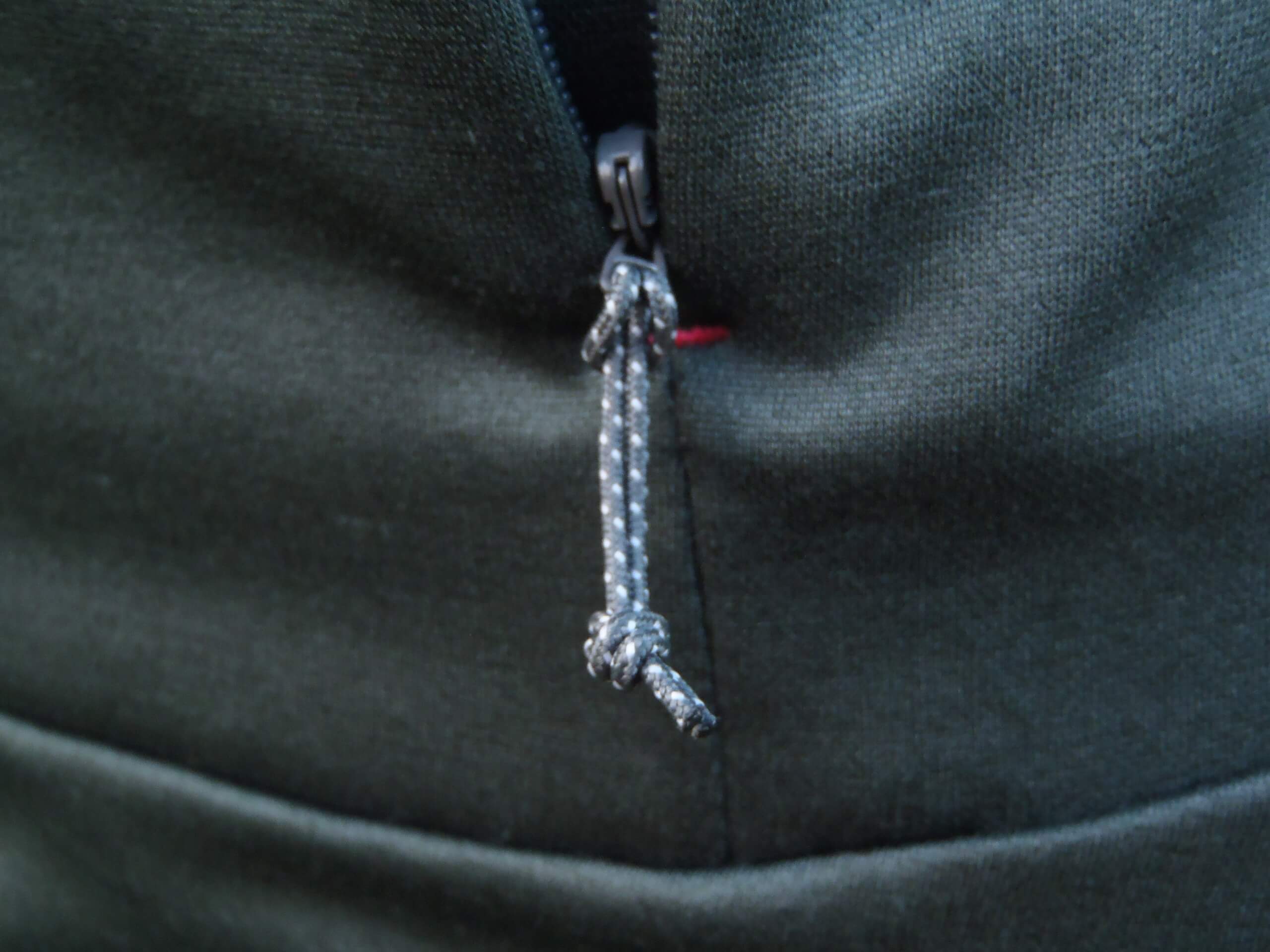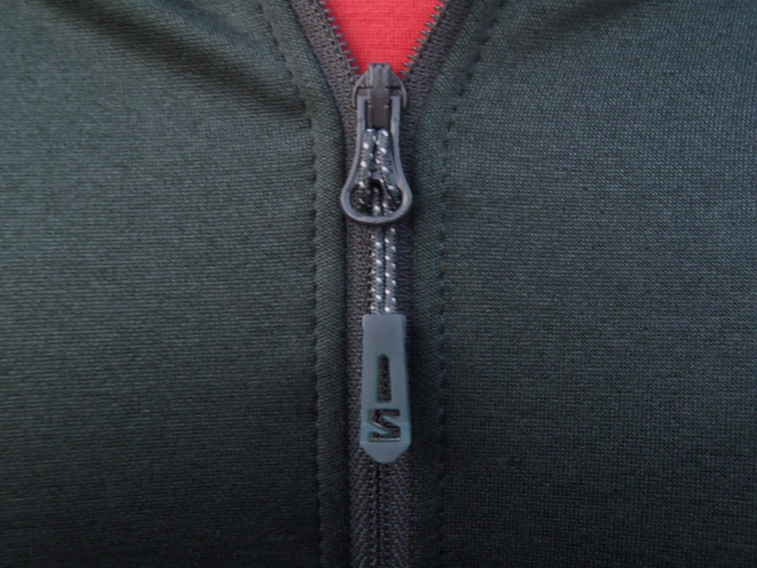 Dvojice kapes s nenápadnými zipy po zapnutí takřka nejsou vidět. Vnitřek kapes je síťovaný a umožňuje z vnitřní strany bundy vytvořit další dvě „záložní“ kapsy, jelikož dno vložených kapes je zašité. Začátek i konec zipu kapsy je zesílen kontrastním rýglem tak, aby se kapsa nijak nepárala. Táhlo zipu je taktéž decentní, přesto se dobře drží, jelikož se jedná o protaženou tuhou šňůrku s uzlíkem. Všechny zipy včetně hlavního jsou spirálové YKK. Na hlavním zipu, který je opět v barvě mikiny, je táhlo větší a opatřeno plastovým zakončením s logem Salomonu. Takže se dobře drží. Vše sladěno do barev mikiny. I logo na mikině tzv. na levé kapsičce je decentní a přiměřeně veliké.
