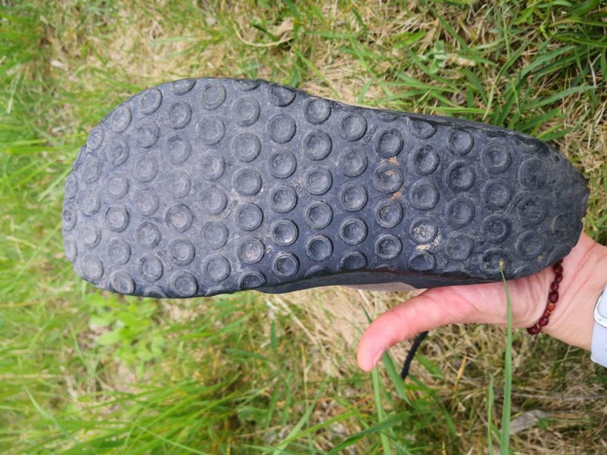 Vibramová podrážka protažená až nad patu ustojí bláto, vlhké kameny, mokré kořeny i kluzký povrch. Navazuje přímo na už zmíněnou gumovou obsázku kryjící patu a palec. Ona vlastně samotná podrážka je protažená až nad patu. I v tomto modelu jsem nachodila pěkných pá kilometrů s batoletem na zádech, takže jsem věnovala hodně pozornosti stabilitě boty i na kluzkých površích a obstály na jedničku.