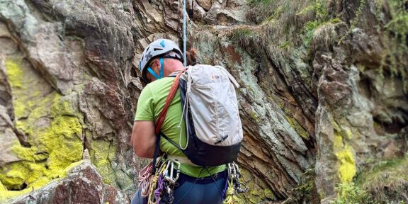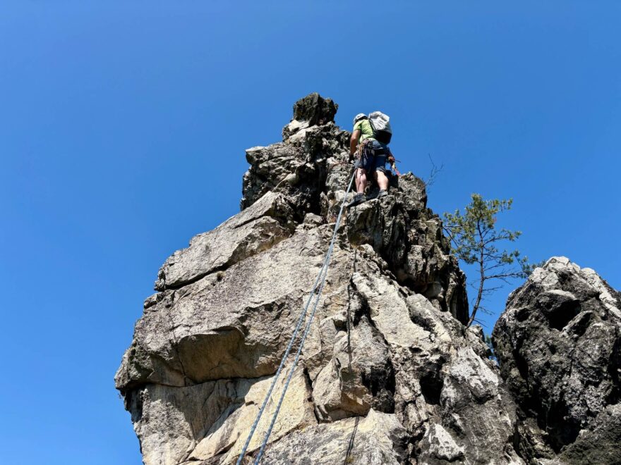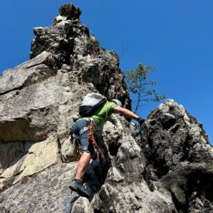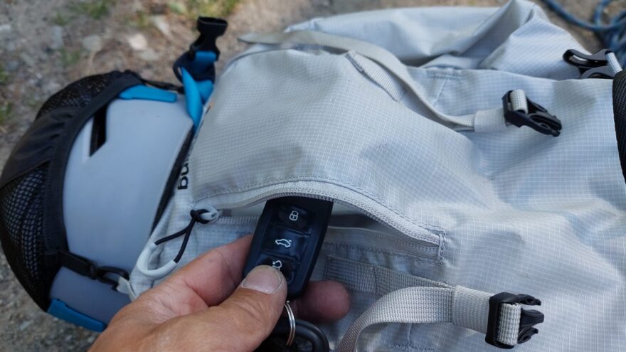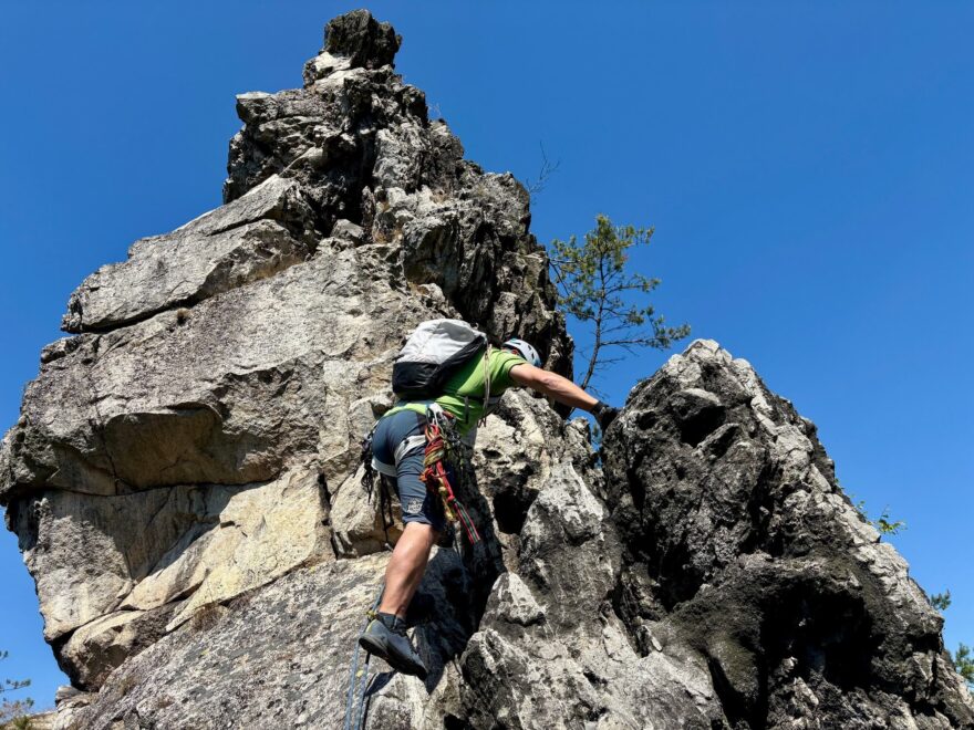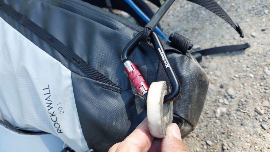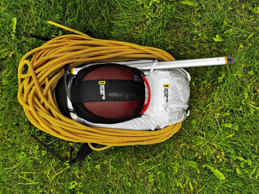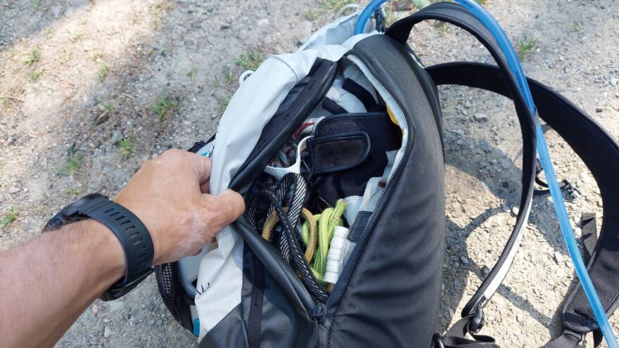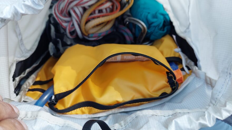 Horní vstup na stahování jednou rukou? Takovou věc oceníš, když se jednou rukou držíš štandu a druhou hledáš foťák, protože západ slunce v Tatrách nepočká. Jinak opravdu praktická věc. Pod pevný vrchlík se zipovou kapsou na drobnosti můžeš vložit lano a zajistit ho dvojicí popruhů s plastovými sponami.