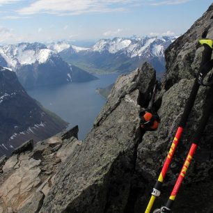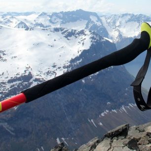 Poutka vylepšená o neoprén pro uživatelsky komfortní použití bez rukavic jsem vyzkoušel jen při rovinatých přechodech. Vzhledem k vysokým teplotám v květnovém Norsku byla poutka vždy na holou ruku – šířka i neoprénové polstrování přesně seděly na velikost ruky v rozmezí 8 až 10. Snadné a rychlé přenastavování délky holí.
