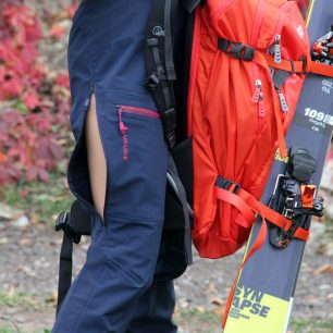 U všech lyžařských a skialpový kalhot se řeší, jak se dají přetáhnout a fixovat přes komín skeletu. Vaude to vyřešilo zipem a rozšířenou nohavicí, takže přetažení přes skelet a dotažení je velmi snadné s dostatkem volného prostoru. Převlečné zakončení nohavic je zpevněno a zodolněno proti oděru a možnému proříznutí hranami lyží materiálem Cordura. Samotný konec nohavic je z vnitřní strany vylepšen o pružnou légu, která dobře obepíná skelet jak při stoupání, tak při sjezdu.