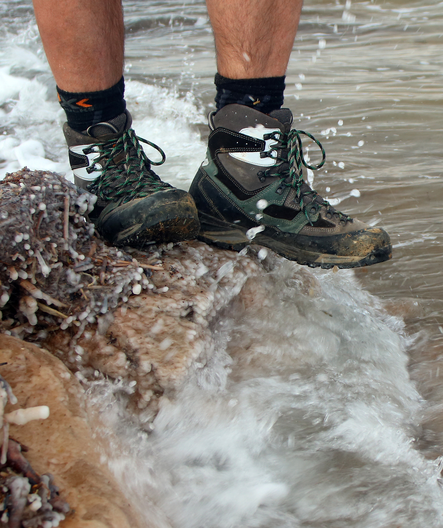 SOCOMPA GTX nevadily ani extrémně silná slanost vody z Mrtvého moře, jehož salinita (cca 30 procent je skoro 10krát silnější jak normální mořská voda). I po potřísnění od příboje z rozbouřených vln „Moře soli“ během příchodu silné bouře a ničivých záplav, během kterých v Jordánsku zahynuly přes dvě desítky lidí, agresivní sůl jejich povrch nijak viditelně neponičila a Gore-texová membrána Duracom MS Sportive umožnila bezproblémové, bezpečné a suché překonávání náhle vzniklých potoků, říček a brodů.