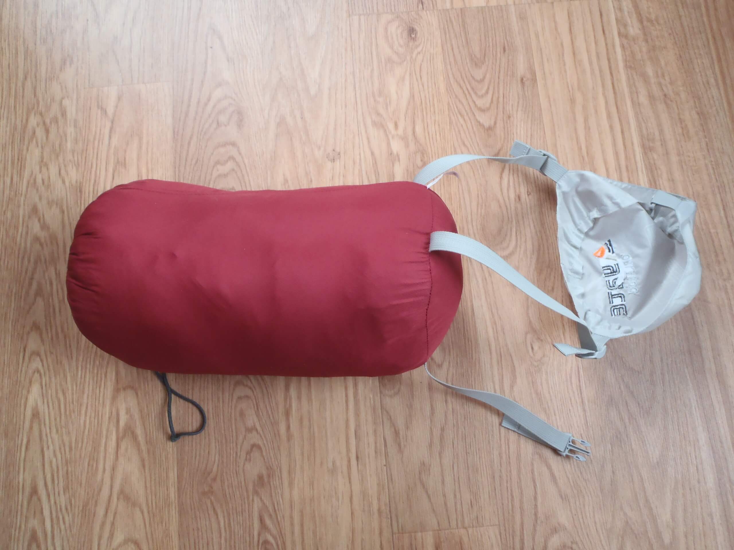 Spacák je dodáván v kompresním obalu o velikosti 32×20 cm. Samotný vak je na dotek z jemného, ale pevného materiálu, překrývající „vrchlík“ je ještě podstatně odolnější. Na první pohled vydrží i neurvalé zacházení a stahování třemi pásky. Jeden z těchto pásků je pro snadnější vytahování a balení spacáku vybaven přezkou (trojzubcem), což výrazně ulehčuje veškerou manipulaci. Na vrchlíku jsou kromě loga YATE a názvu modelu uvedeny teplotní rozsahy od -3˚ C až do extrému -15˚ C, dále použité náplně a textilie. Popruhy však nejsou vedeny přes dnou obalu, ale jsou zašity do jeho švu. Uvidíme, kolik toho šití vydrží.