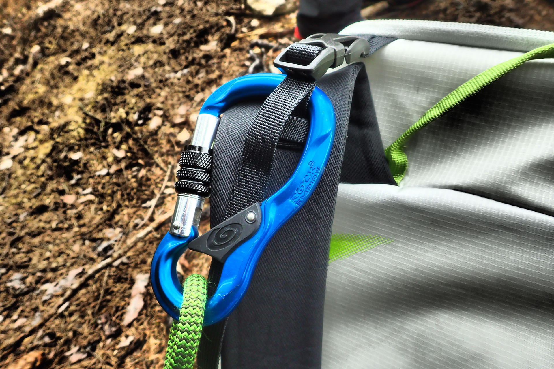 Karabina ROCK EMPIRE 2TAP připravena na batohu k zajištění dojištění na zajištěné cestě.
