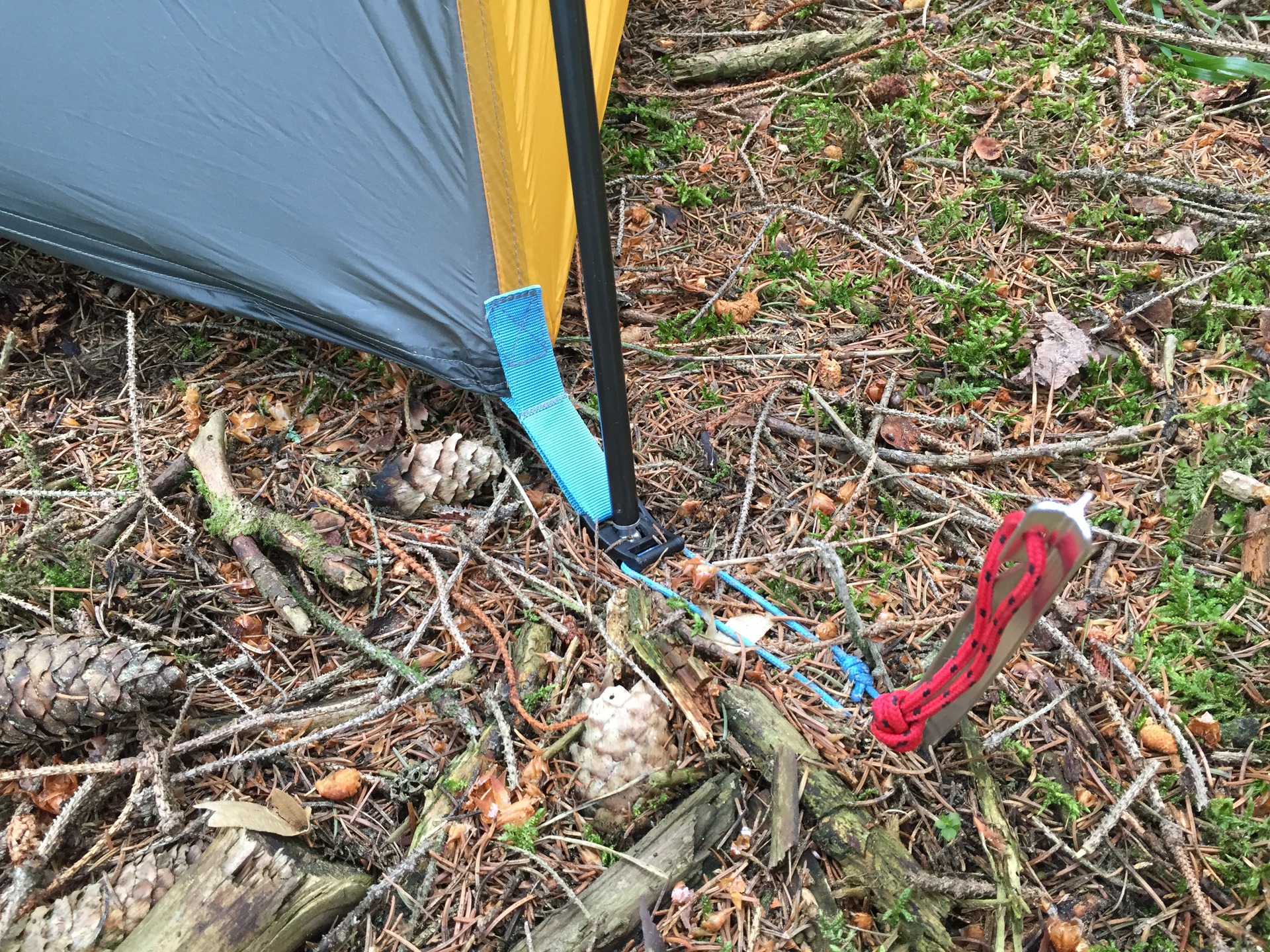 Tropiko samozřejmě obsahuje řadu dalších kotvících oček pro vypnutí pomocí přibalených šňůr. Doladění vypnutí tropika je pomocí REEP šňůr otázkou chvilky. Ke kolíkům je třeba chovat se s citem, jakékoli drsnější zacházení vedlo k jejich ohýbání 🙂 Samotné kolíky při tlačení do země dost píchaly do dlaní (jak neobvyklé), proto doporučuji pro pohodlné zatlačení využít kladek nebo kámen.