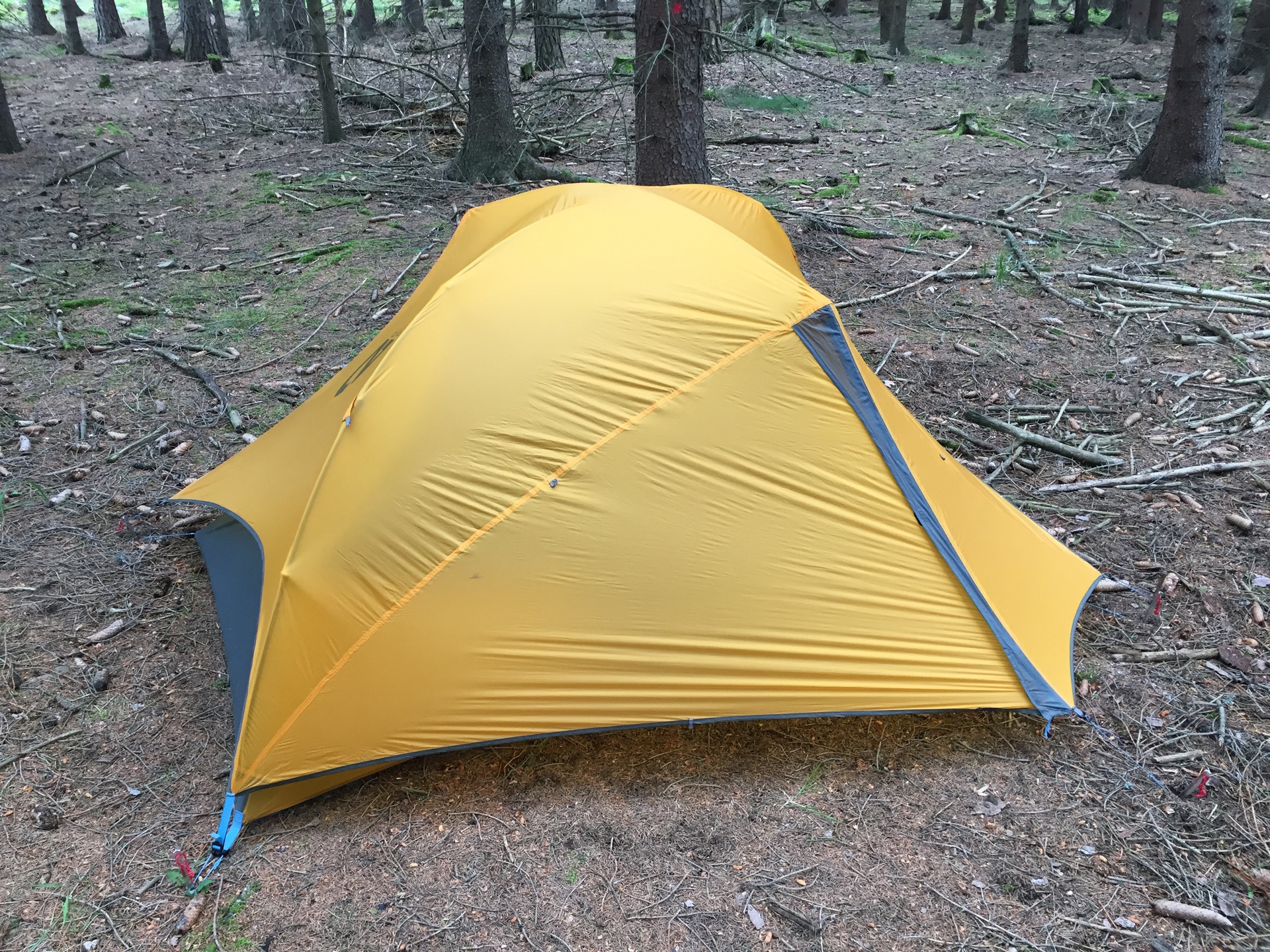 Stan Nemo Blaze 2P mě během používání oslnil svojí váhou a sbalitelností. Není problém tropiko i vnitřní stan jednoduše nacpat do obalu. Pokud jsem nechal tyčky mimo, vznikl balíček o velikosti cca 15 x 26 cm. Když je stan mokrý, není potřeba ho balil do takto malého objemu, v tuto chvíli využijeme celého objemu skladovacího vaku, což je cca 15 x 43 cm (tyčky mohou být vevnitř). Stan jsem stavěl úmyslně na místech, na kterých byl přímo vystaven „přírodním živlům”, abych otestoval jeho hybridní konstrukci.
