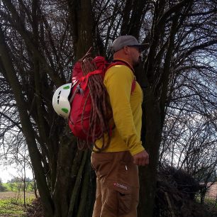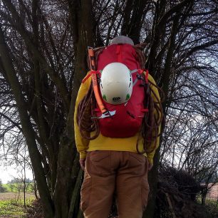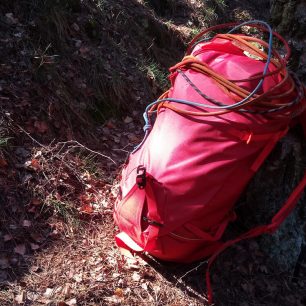 Na čelní panel batohu se přidělávají cepíny a na bocích jsou popruhy pro připevnění lyží. Cepíny se fixují velmi jednoduchým způsobem – systémem Headlocker. Hlavicí cepínu provlečete hliníkovou příčku na pružné tkanici. Zobáky jsou navíc jištěny kusem silné látky tak, aby přiléhaly k batohu. Topůrka se fixují pomocí horních kompresních popruhů, které jsou na čelním panelů založené a stahují tak perfektně topůrka cepínů. Stejně tak můžete fixovat i teleskopické hole. Pouze hrot holí založíte za gumičky systému Headlocker. Z boku je možno klasicky zastrčit lyže a to i takové, které narostly do šířky. Moje K2 Wayback se šířkou pod patou 106 mm se tam vklouzly jako kouzlo Vánoc. Spodní oko je hrubě zesíleno. Horní kompresní popruh zajišťuje lyže ve svislé pozici. Osobně ještě lyže stahuji přes špičku do typického „Áčka“. Pod vrchlík je možno díky integrovanému popruhu fixovat lano tak, aby nesjíždělo. Jinak mačky nebo jiná výzbroj musí do batohu, který díky objemu 40 lit. toho zvládne odnést docela hodně.