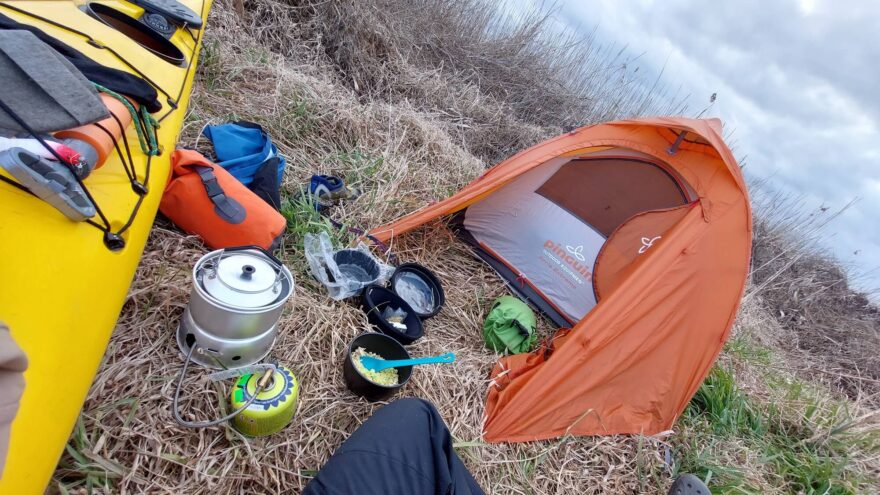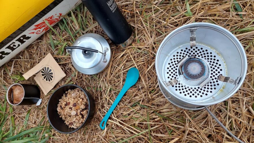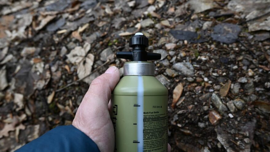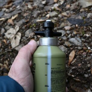 Nejprve jsem vyzkoušel vaření na lihu. Ten jsem měl uschován a na přepravu jsem používal speciální lahev s bezpečnostním uzávěrem, který netřeba sundávat, a tak ho nikdy neztratíte. Nalévání je pohodlné, a to díky odvzdušnění. Lahev je opatřena mírkou. Osobě bych uvítal hrubší vzorek na samotném uzávěru tak, aby neklouzal a bylo snadnější ho povolit či utáhnout i třeba s mastnými nebo prokřehlými prsty. A po uzavření ventilu doporučuji ještě lahev buď otočit vzhůru nohama na hořákem nebo mimo vybavení tak, aby malý zbyteček paliva nevytekl třeba do batohu.