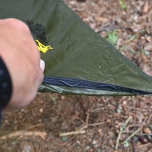 Rozměr takřka 3×3 metry je dostačují bohatě pro spaní dvou osob, ale zvládne i tři kusy. Při použití jako „párty“ stan či přístřeší pro sezení se pod něj vejde spousty dobrých lidí. Plachta je po svém obvodu opatřena „nekonečným“ množstvím ok k fixaci nebo dopnutí plachty do požadovaného tvaru. V rozích jsou pak pevná a silná oka k základnímu zafixování. Vybrat si můžete ze dvou barev: olive green, nugget gold. Každá barva má svoje. Osobně bych chtěl obě. Testována byla varianta zelená, která je v lese opravdu nenápadná. Oboustranně silikonizovaný ripstop nylon 30D pro maximální pevnost a odolnost, při minimální hmotnosti plachty funguje skvěle. S nějakým promočením či propršením nepočítejte. Přesto je dobré zmínit, že středový šev, který není ošetřený žádným lepením (tedy žádný z švů) a proto je dobré pro jeho opravdovou a spolehlivou nepropustnost vody při silnějším dešti jej ošetřit přípravkem k utěsnění (např. Seam grip). To je taky materiál, který je při balení jako živý a klouže po sobě. Balení chce cvik, ale za to se vám odmění minimalistickým balíčkem.