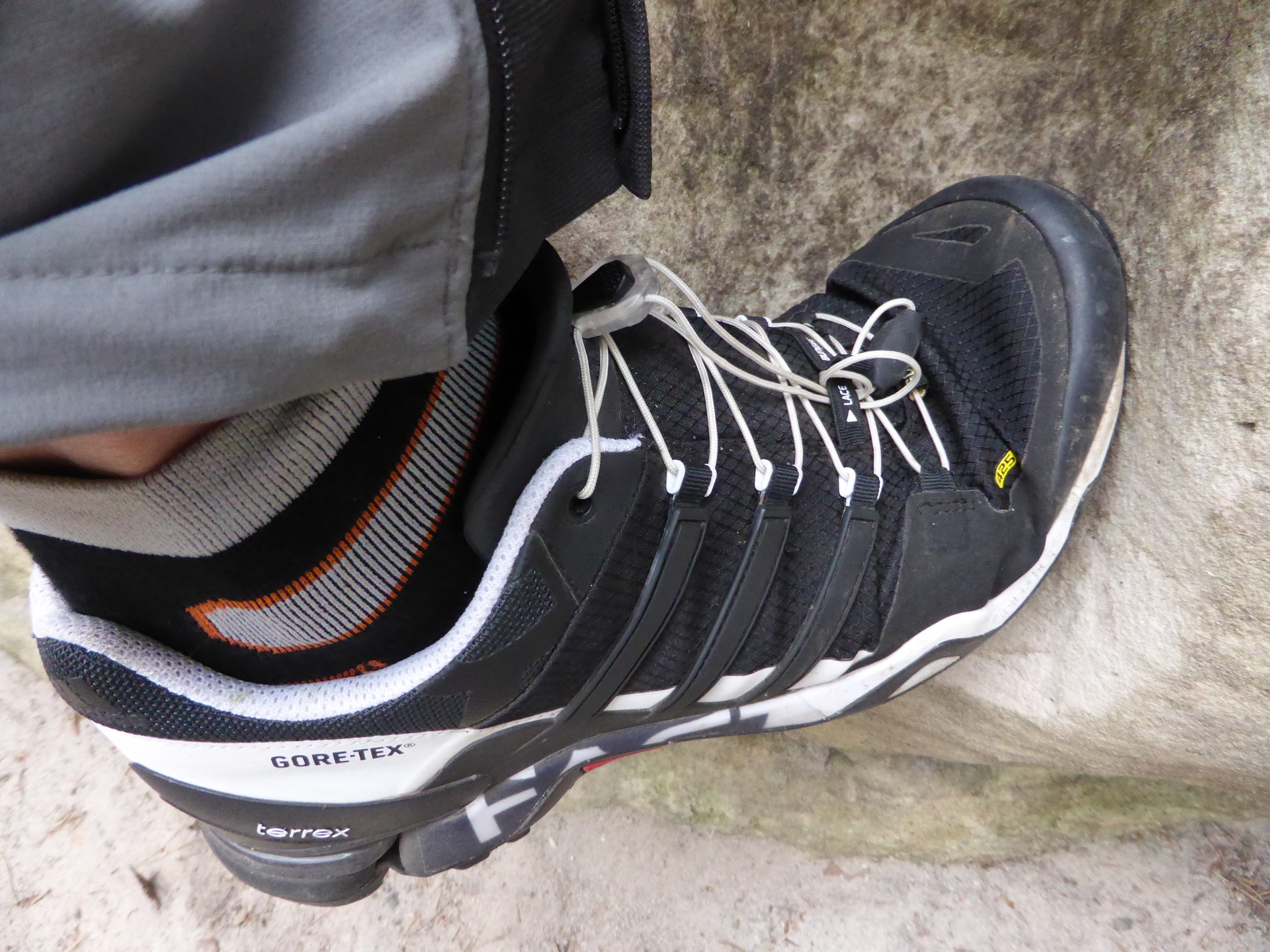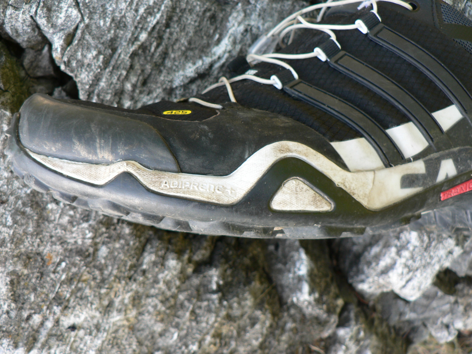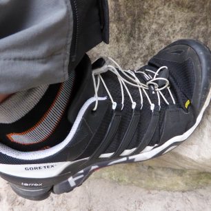 Boty jsou skutečně pohodlné, čemuž napomáhá použití technologie Adiprene+ v mezipodešvi pod přední částí chodidla, kdy napomáhá při odrazu odpružením. Navíc se díky tvarové stálosti časem méně deformuje než klasická EVA pěna, která se v mezipodešvích běžně používá. Odolnosti boty pomáhá i gumová obsázka na špičce, která při mé těžko ovladatelné velikosti 47+ dostává opravdu zabrat a nejednou ochránila mé prsty před bolestivým zraněním (alespoň by se mi možná o něco zmenšila noha…). Nesmím zapomenout na komfort suché nohy uvnitř boty. Stélka Ortholite odvádí vlhkost od chodidla a má prý i antimikrobiální účinky (je pravda, že mi zatím nohy hnít nezačaly a pokud by měly, tak to svedu na jiné boty, třeba na brusle). Vlhkost je odváděna porézní goretexovou membránou, která ji naopak nepustí dovnitř. Takže pokud vám voda (nebo něco jiného při noční bojovce) nenateče shora, jste v suchu.