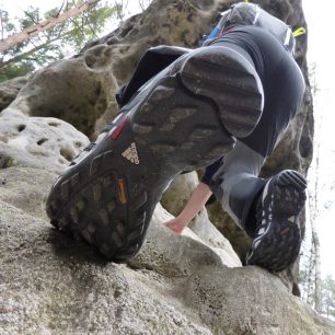 Podešev pro mě zas až takovým překvapením nebyla. Ale nemyslím to nijak špatně, ba naopak, nemám k ní snad jedinou výtku, už jsem jedny boty s touto směsí totiž recenzoval. Spojení adidasu s výrobcem pneumatik Continental byl strategicky dobrý krok, výrazně profilovaná podrážka Traxion má až nečekaný grip. Pouštěl jsem se do různých terénů a na různé povrchy, abych si ověřil mé zimní poznatky. Opravdu jsem neshledal snad jediný problém, drží, dá se říci, na všem a za rozličných povětrnostních podmínek. Až člověk občas usne na vavřínech a přestane dávat pozor, kam a jakým způsobem šlape, šlupce od banánu zkrátka žádná bota neodolá. Ne, ale vážně, co si pamatuji, tak z neopatrnosti jsem uklouzl pouze na slizkém mokrém kmenu padlého stromu. Není to jen o přilnavosti k podloží, ale drapáky si poradí i s rozměklým nebo sypkým podkladem.