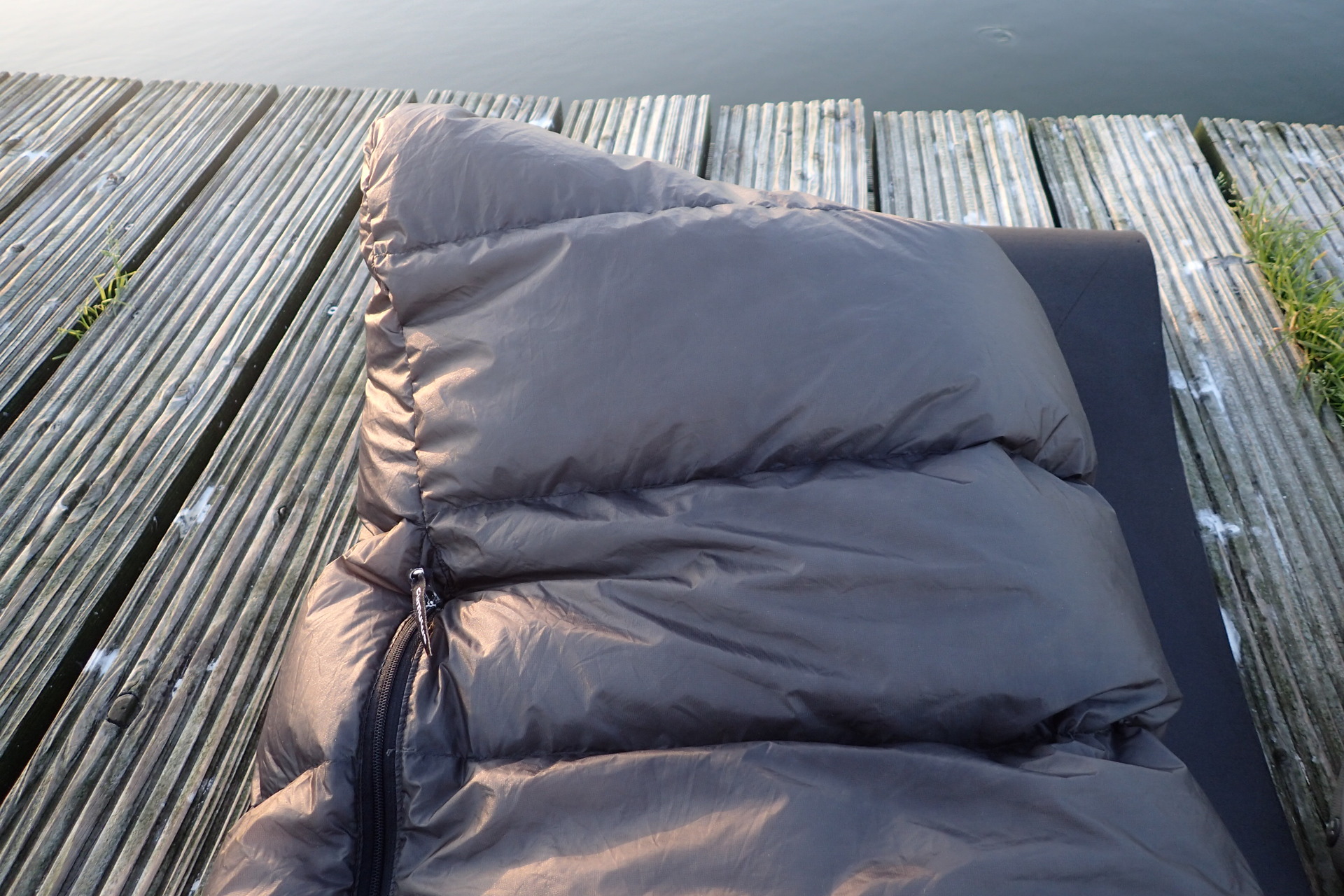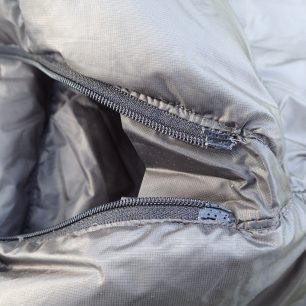 Konstrukce komor je jednoduchá – tedy materiál svrchní i vnitřní je prošitý skrz – studené švy. Proti světlu je spacák lehce průsvitný. Použitým materiálem je ultralehký Toray Airtastic, 20 g/m2, který je opravdu velmi příjemný na dotek. Větruodolný. Podle údajů výrobce i s povrchovou vodoodpudivou úpravou DWR. Během testování nedošlo materiálem k průniku peří. Pouze v hlavním podélném švu (na opačné straně než je zip) k ojedinělému vykukování několika kusů chmýří.