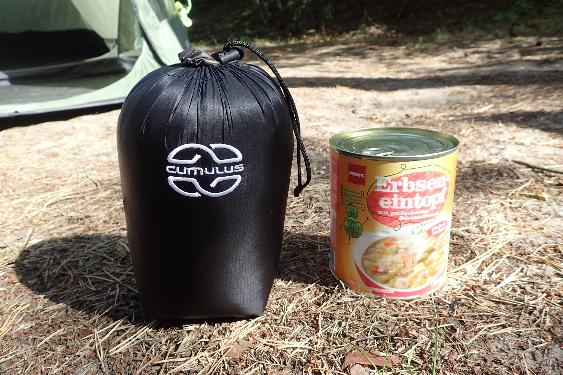 Porovnání velikosti sbaleného spacáku Cumulus Magic 125 Zip s německým eintopfem.