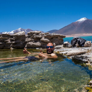 Laguna Verde je obrovské jezero nacházející se ve výšce nad čtyři tisíce metrů. Spousta expedic se tam zastavuje a místo využívá jako první výškový tábor. My si dáváme jen horkou koupel v místních termálních pramenech a pak míříme dál do refugia Lucero. Během několika hodin jsme se autem přesunuli z 300 m n. m. do 4 200 m n. m. a ta výška je znát. Bolí nás oba hlava, jsme unavení a slabí.