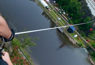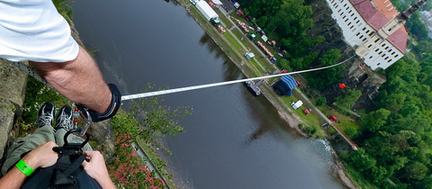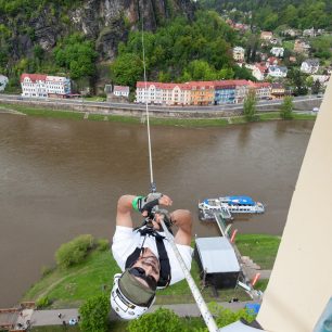Extreme travers: cca 300 metrů dlouhé přelanění kaňonu Labe do zámecké věže ve výšce cca 100 metrů nad hladinou