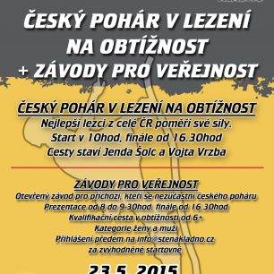 V sobotu 23. května 2015 se na Lezecké stěně Kladno uskuteční 3. kolo Českého poháru ve sportovním lezení na obtížnost, který je současně i nominačním závodem do české reprezentace. Zároveň proběhne i závod pro veřejnost, ve kterém si budou příchozí moci vyzkoušet závodní atmosféru na cestách lehčí obtížnosti. Závod v lezení na obtížnost je divácky velmi zajímavý, obzvláště jeho finále, které začne v 16:30 pro ženy a v 18 hodin pro muže. Tak se nechte zlákat, ať už jako závodníci, či jako diváci.